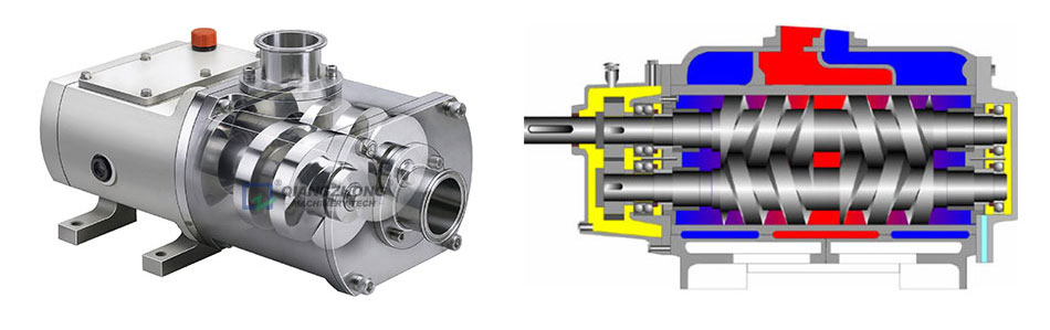 双螺旋输送泵采用开放式、模块化的卫生结构,整个系统由泵体,传动齿轮箱,电机三个主要部分组成。所有和物料接触的部分都采用高等级优质304/316L不锈钢,传动部分也采用球墨、304不锈钢和铸钢三种材质,保持设备的高等级、高质量。作为整个系统核心部件的泵体,由前腔盖、腔体、螺旋转子、传动轴、机封腔体、机械密封等部分组成。传动轴采用粗壮加强型设计,通体一体化结构,选用优质的、高强度的特殊沉淀不锈钢材料,经过固熔和硬化处理。